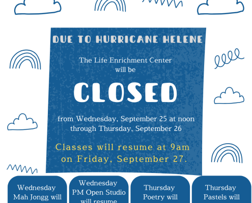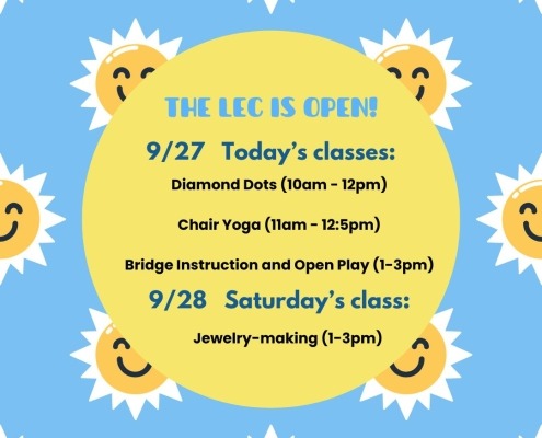 Due to the impending hurricane, the LEC will be closing at noon on Wednesday, September 25. Classes will resume at 9am on Friday, September 27.