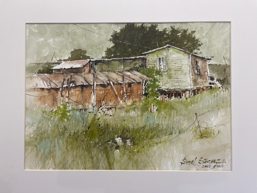In this painting, award-winning watercolorist and LEC instructor Lionel Sanchez depicts a rural scene with an expertly-crafted architectural subject matter. Lionel’s focus on strong composition is evident in this scene as he skillfully draws the viewer’s eye toward the subject matter with bold expressive lines, light, shadow, varying green hues, and unexpected pops of color.